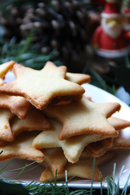 Wszystkie składniki połączyć ze sobą i zagnieść kruche ciasto. Uformować kulę i przełożyć ją do woreczka. Wstawić do zamrażalnika na co najmniej 1 godzinę. Gdy ciasto będzie mocno schłodzone to podzielić je na 4 części i każdą część w miarę cienko rozwałkować. Za pomocą foremki, np. gwiazdki wyciąć ciasteczka. Następnie przełożyć je na formę do pieczenia (którą wcześniej należy wysmarować masłem). Piec około 15 minut w 195ºC (aż do zarumienienia).