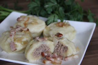 Ostatnio pokazałam Wam przepis na knedle nadziane białym serem. Dzisiaj zachęcam do przygotowanie mięsnej wersji - knedli nadzianych mięsem mielonym i polanych podsmażoną cebulką wraz z dodatkiem wędzonego boczku. Pyszne połączenie składników :)
