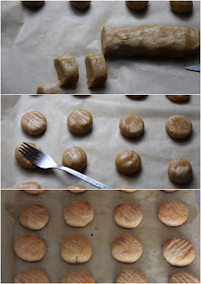 Składniki przełożyć do miski. Za pomocą robota kuchennego wszystko ze sobą połączyć (aż do uzyskania plastycznej masy). Uformować wałek, podzielić go na pół, a następnie na 8 części. Z każdego kawałka uformować kulkę. Ciasteczka przełożyć na blachę wyłożoną papierem do pieczenia. Lekko spłaszczyć. Za pomocą widelca odcisnąć wzorek. Ciasteczka piec około 15-20 minut w 180ºC (do zezłocenia). Podawać po ostudzeniu.